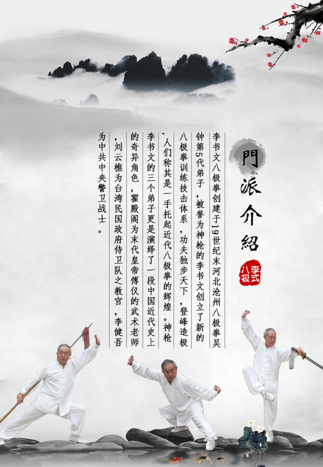 李书文八极拳门派精髓: 大八极拳 、 小八极拳 、 劈挂拳 、 六合花枪 、 行者棍 、 万胜双刀 、 纯阳剑 ,现已收录为邵阳市级非物质文化遗产项目名录。